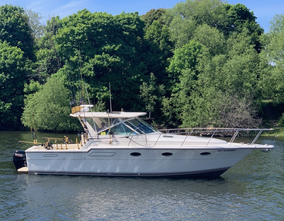 The "Netminder" is a 36' Tiara with a wide open deck. She is built for big water sportfishing. Tiara is one of the most comfortable fishing boats on the market today, her wide beam and open fishing deck offers plenty of room for your fishing party. Features include a private stand-up head, an eating area, an indoor cabin.